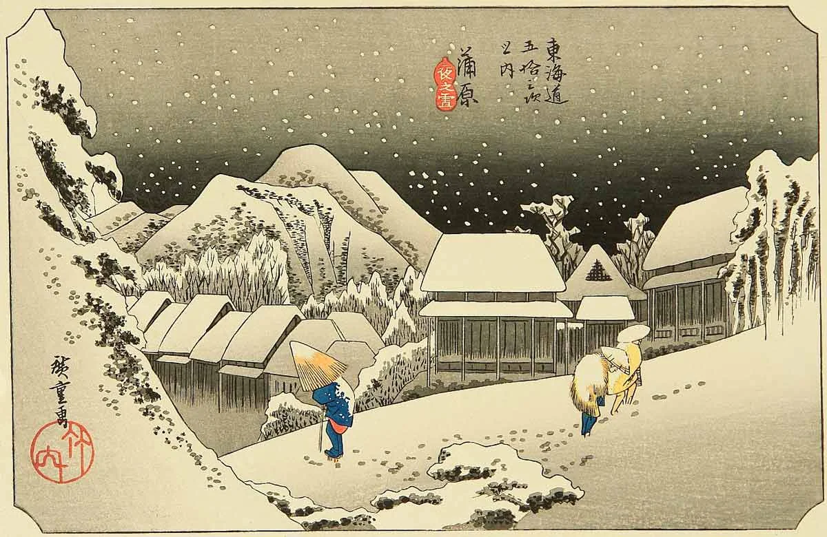 Over his career he crafted a number of monumental series, but perhaps Hiroshige is most famous for The Fifty-Three Stations of the Tokaido produced in 1833–1834. In this series, he documents the journey along the Tokaido. The Tokaido, or Eastern Sea Road, was once the arterial highway of Japan connected the Shogun’s seat of power in Edo (current day Tokyo) with the imperial capital of Kyoto.